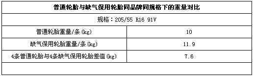 普通轮胎与缺气保用轮胎同品牌同规格下的重量对比